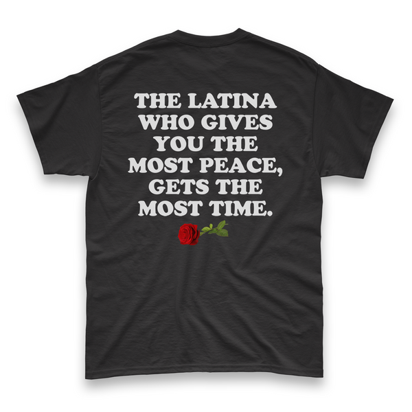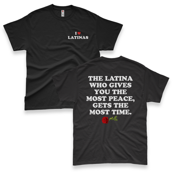 This latest design showcases printing on both the front and back of the shirt. The front left chest displays a sleek "I ❤️ Latinas" logo, while the back features the phrase "The Latina Who Gives You The Most Peace Gets The Most Time". Only found here at Latinas & Co.!