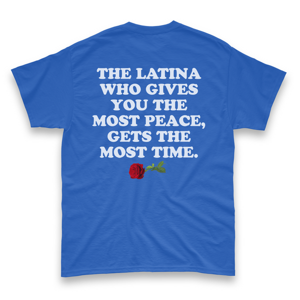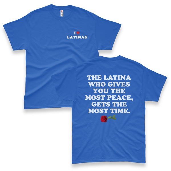 This latest design showcases printing on both the front and back of the shirt. The front left chest displays a sleek "I ❤️ Latinas" logo, while the back features the phrase "The Latina Who Gives You The Most Peace Gets The Most Time". Only found here at Latinas & Co.!