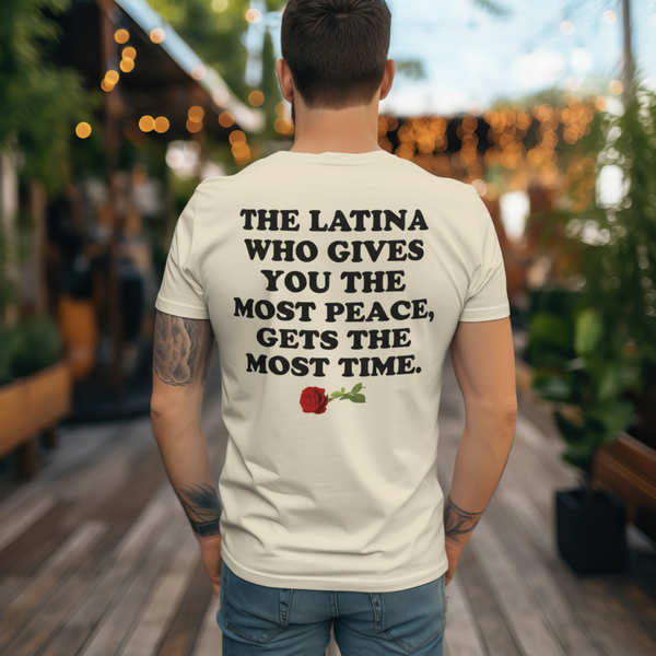 This latest design showcases printing on both the front and back of the shirt. The front left chest displays a sleek "I ❤️ Latinas" logo, while the back features the phrase "The Latina Who Gives You The Most Peace Gets The Most Time". Only found here at Latinas & Co.!