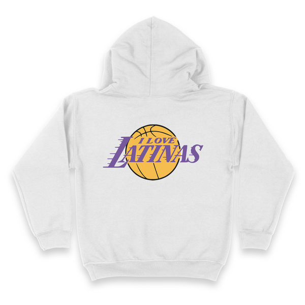 This latest design showcases printing on both the front and back of the hoodie. Featuring a popular LA basketball team inspired logo on the chest/back and a curvy Latina logo above the bottom hem. Perfect for basketball season!