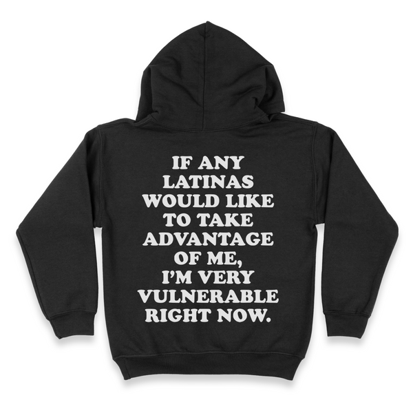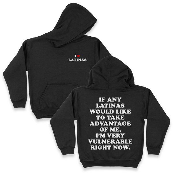 This latest design showcases printing on both the front and back of the hoodie. The front left chest displays a sleek "I Love Latinas" logo, while the back features the phrase "If Any Latinas Want To Take Advantage Of Me, I'm Very Vulnerable Right Now".