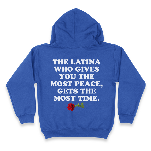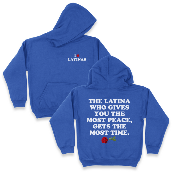 This latest design showcases printing on both the front and back of the hoodie. The front left chest displays a sleek "I Love Latinas" logo, while the back features the phrase "The Latina Who Gives You The Most Peace Gets The Most Time". Only found here at Latinas & Co.!