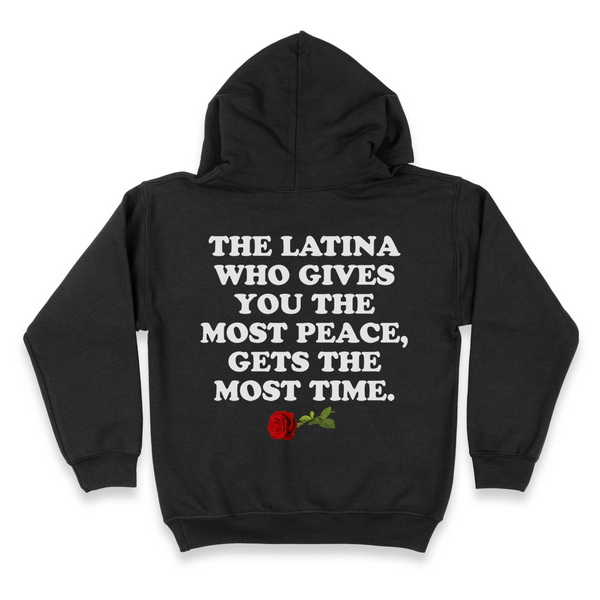 This latest design showcases printing on both the front and back of the hoodie. The front left chest displays a sleek "I ❤️ Latinas" logo, while the back features the phrase "The Latina Who Gives You The Most Peace Gets The Most Time". Only found here at Latinas & Co.!